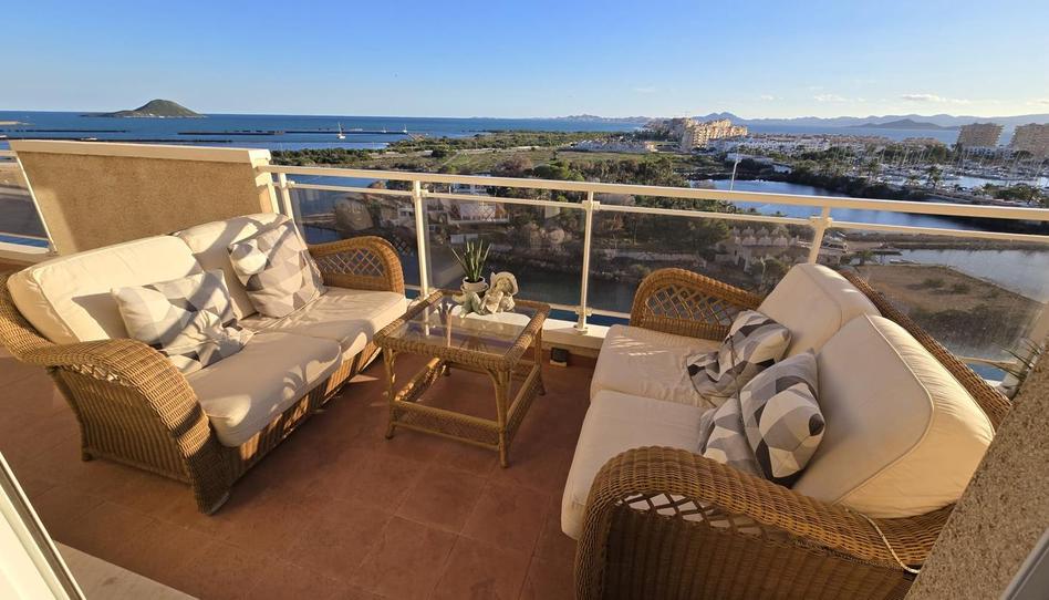 Hermoso ático frontal al canal con maravillosas vistas a los dos mares, el puerto deportivo Tomás Maestre y las espectaculares puestas del sol. Con hall de entrada, son 3 dormitorios, 2 baños, cocina independiente y salón comedor con chimenea. Tiene una amplia terraza frontal a la que tienen acceso todas las habitaciones, la cocina y el salón. Además hay un gran solárium con ducha y barbacoa, al que se accede directamente desde la vivienda. Se vende completamente amueblado, equipado con aire acondicionado y ventiladores de techo. Zonas comunitarias con amplio jardín, parque infantil y gran piscina. Parking en sótano Nº 288.