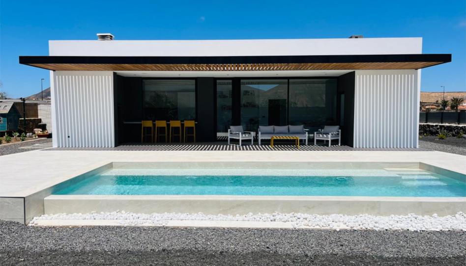 VILLA con piscina en la Oliva de nueva construcción. Dispone de 3 habitaciones, 3 baños, cocina y salón, chimenea de leña, porche cubierto y pérgola de madera, todos los materiales son de primera calidad, suelos de porcelanico en interiores y exteriores, piscina desbordante revestida en porcelanico del mismo material del solarium. maderas de IPE en pérgola y suelos exteriores, piedra natural volcánica en cochera y pasillos. los interiores disponen de techos altos en todas sus estancias, tambien tiene aire acondicionado oculto en la zona de estar. la finca consta de 1000 m2 completamente vallada. consumo eléctrico 0€, ya que esta equipada con un sistema fotovoltaico muy potente que cubre todos los consumo eléctricos de la vivienda.
