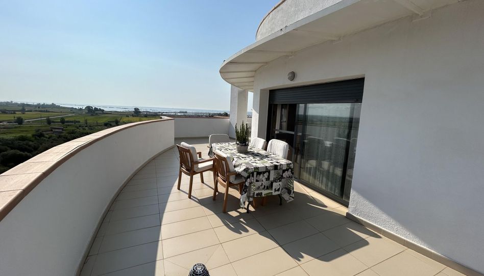 Terraza de 90 m2 soleada todo el día con vistas al Delta del Ebro, el mar y el Montsiá.