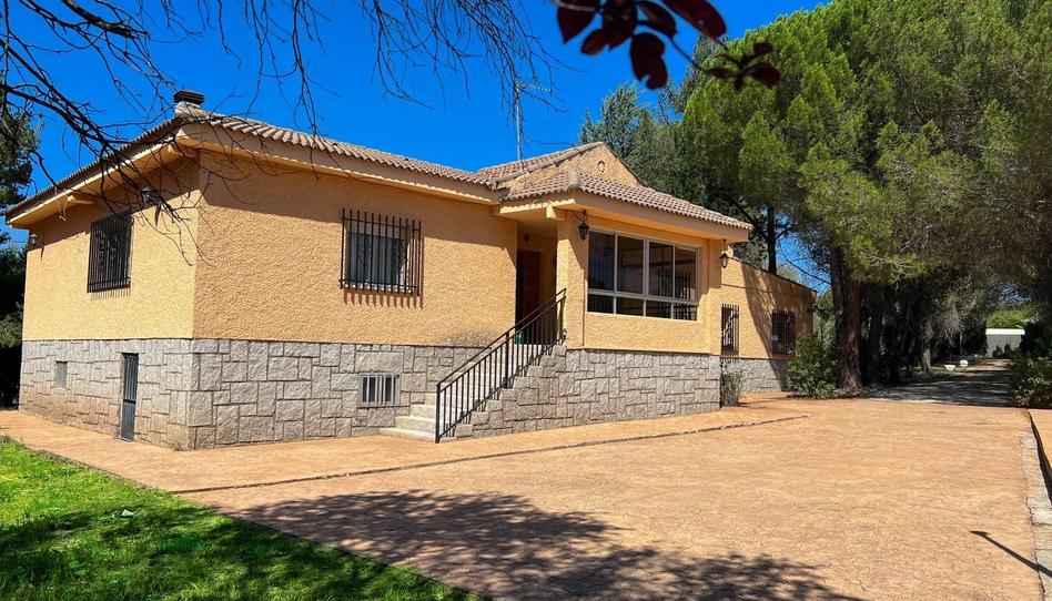 La parcela totalmente vallada, plana, con acceso peatonal y de vehículos, con 40 m de ancho y 88 de fondo, zona de barbacoa, piscina con solárium de 30 m2, iluminada, cenador, con zonas ajardinadas y solada con cemento impreso, riego automático, podemos encontrar pinos flanqueando el camino de entrada a la casa, chopos, prunos, algún ciruelo etc. Además de los columpios, algún elemento ornamental, como una fuente. Alguna afloración de rocas graníticas características de esta zona de la sierra hay un pozo, y además dispone de agua del Canal, pero no de alcantarillado que se suple con una fosa séptica. También el depósito de gas propano GLP, que abastece la caldera mixta de la vivienda.