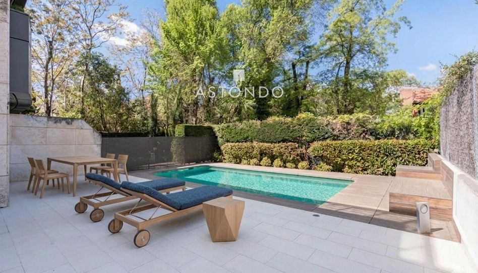 La planta baja esta formada por: hall de entrada, aseo de cortesía, ascensor y escalera que nos distribuyen a las plantas superiores de la vivienda. Una espaciosa y luminosa cocina con office, esta comunicada con un amplio lavadero-tendedero que a su vez tiene salida al jardín. Cuenta con un amplio y luminoso salón con chimenea que está dividido en dos zonas, comedor y salón, ambas zonas con salida al jardín. En la salida del salón accedemos a la zona donde se encuentra la piscina y por la salida del comedor encontramos un espacio chill out del jardín. En un lateral del jardín hay una escalera que da acceso al sótano, es un espacio amplio y luminoso que puede albergar diferentes usos como gimnasio, bodega, etc.
