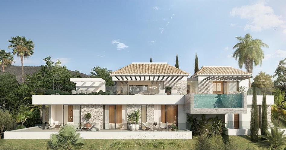 Preciosa villa moderna con vistas al mar en la prestigiosa zona de Santa María Golf cerca de todo tipo de servicios, a 5 minutos de la playa y rodeada de un valle con densa vegetación compuesta por pinos, robles, alcornoques y acebuches.