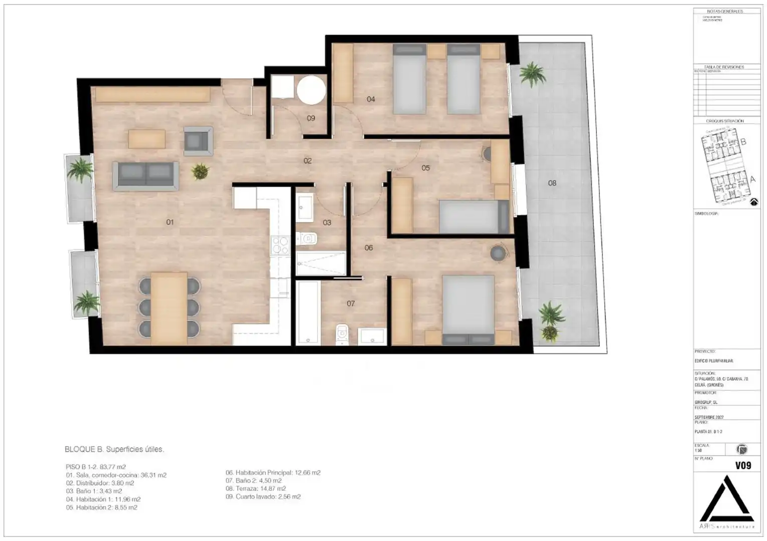 Habitatges de planta baixa i pisos, desde 68 m2 fins a 95 m2, disponibilitat de 2 o 3 habitacions amb balcons i terrrasses a les plantes baixes fins a 34m2. Destaca la zona de cuina - menjador oberta, àmplia i amb molta llum, habitacions complertes amb una suite principal. Calefacció de gas amb també pre - instal·lació d´aire condicionat. Soterrani amb garatge comunitari on cal destacar les 15 places d´aparcament àmplies.