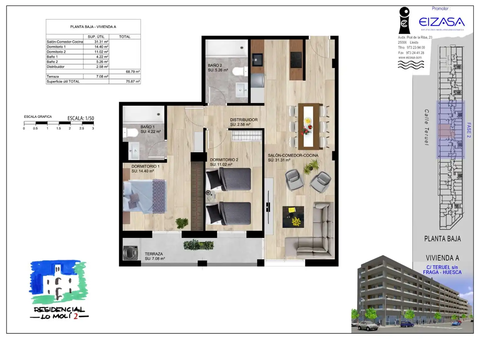 Eizasa ha llevado a cabo la 2ª Fase del Conjunto Residencial LO MOLI II. Esta nueva construcción es la continuación del ya ejecutado edificio LO MOLI II, al lado de los juzgados de Fraga, en la Calle Teruel.