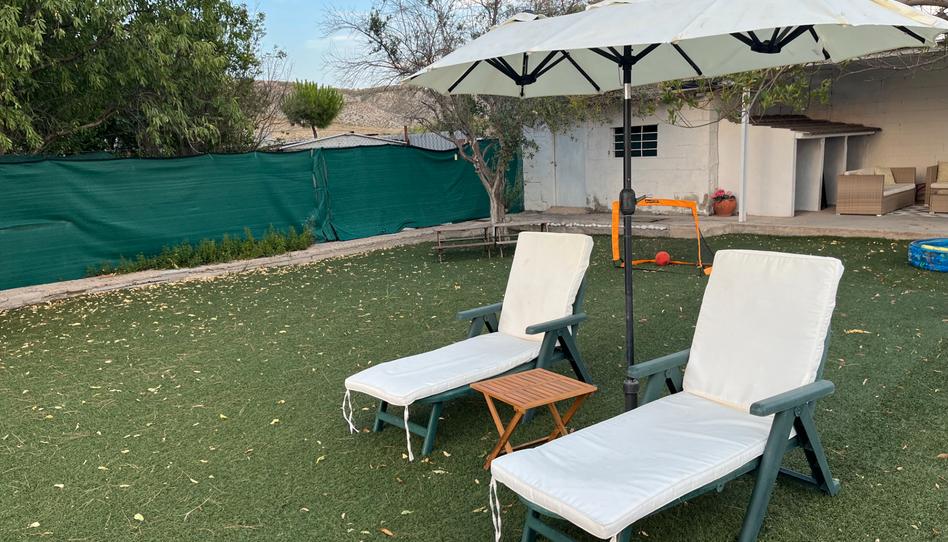 La finca está ajardinada, con arbolado ornamental y frutales (laurel, higuera, albaricoque, almentro, olivos, etc), con césped artificial especial francés (que no quema y simula perfectamente el césped natural), zona de merendero con barbacoa ideal para reuniones familiares y de amigos, trastero con sistema perfecto de placas solares de alta calidad para garantizar un perfecto funcionamiento de luces en la casa y en el jardín, otro trastero almacen amplio, varias terrazas solarium para tomar el sol, elementos decorarativos como pozo , merendero de piedra y jardineras, asi como bonita solara de hormigón para evitar crecer la hierba y andadores embaldosados. Zona de columpios para niños (tobogan, balancin y casita de juegos) PISCINA con depuradora y varias lonas para cubrirla(de invierno y verano), pintada con pintura blanca simulando un agua clara turquesa ideal. Ducha exterior.
