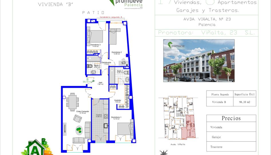 Nueva promoción de viviendas con garajes y trasteros ubicadas en un enclave natural de la capital Palentina, junto al canal, y a un paso del centro de Palencia. Se oferta vivienda de 98 m2 útiles en planta segunda, 2 dormitorios con armarios empotrados , 2 baños y amplio salón estar comedor.