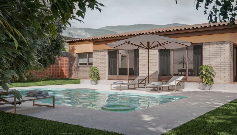 El exterior ofrece un entorno ideal para el relax y el ocio, con piscina privada y amplias zonas ajardinadas.