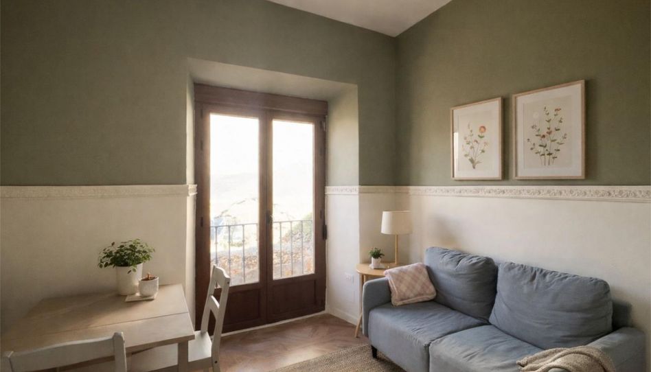 La reforma abarca cada rincón del piso: suelos de parquet en espiga en todas las estancias, paredes con acabado bicolor en verde oliva y blanco con molduras decorativas, carpintería exterior nueva con doble acristalamiento para máximo aislamiento térmico y acústico, y dos baños completamente nuevos con azulejos de diseño y sanitarios modernos.