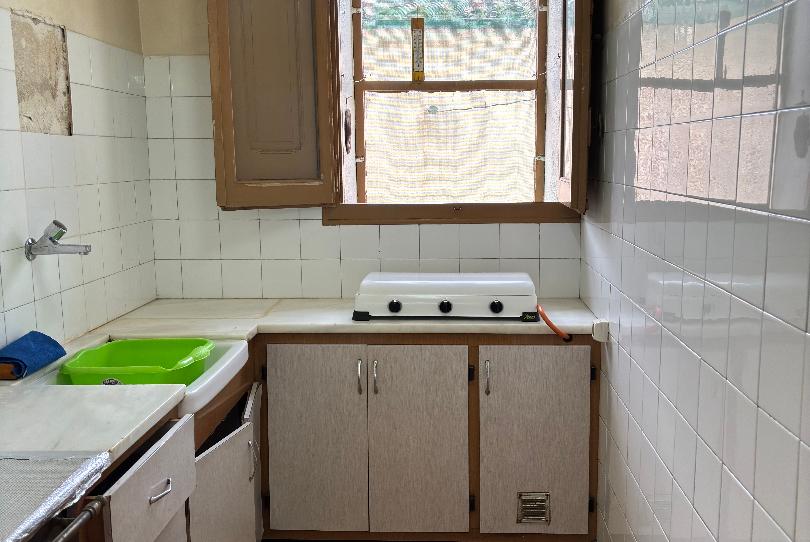 En la primera planta, con entrada a pie llano desde la calle superior, se sitúa la zona principal de la vivienda, compuesta por un comedor, cocina y un aseo con lavabo y WC, sin ducha.