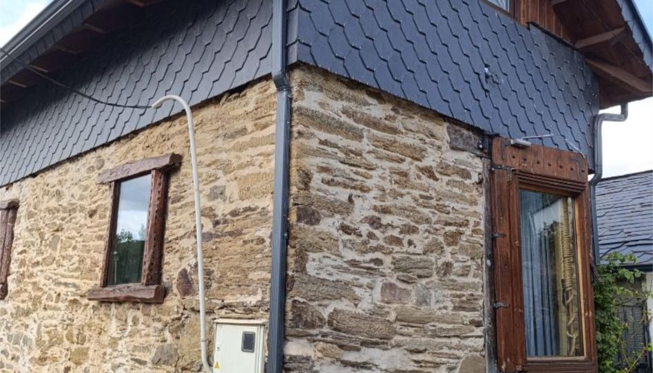 Esta encantadora casa exhibe un estilo arquitectónico rustico, con techo de pizarra negra y una fachada pintoresca que combina piedra y madera.