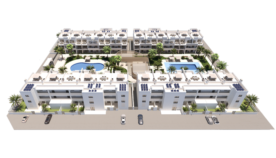 Próxima construcción de 4 bloques con 72 apartamentos, en residencial privado, de los cuales hay variedad de precios si es planta baja con 3 h y 2 baños completos y cocina amueblada totalmente en el precio con patio delantero y patio trasero pequeño lavadero y piscina comunitaria plaza de garaje numerada, también hay 2 plazas para minusválidos, trastero individual en sótano y gimnasio comunitario, todos se entregan con preinstalación de aire acondicionado y cocina y baños completos todas las viviendas los hay de 3 habitaciones y 2 baños completos y de 2 Hab mas 2 baños y pueden ser bajos como este ejemplo que estamos publicando pero también hay varios precios tanto si es planta baja con patio como primera planta con balcón y si es ático pues dispone de solárium privado aparte de todos los servicios comunes. desde 226900 euros hasta 305900 euros los áticos.