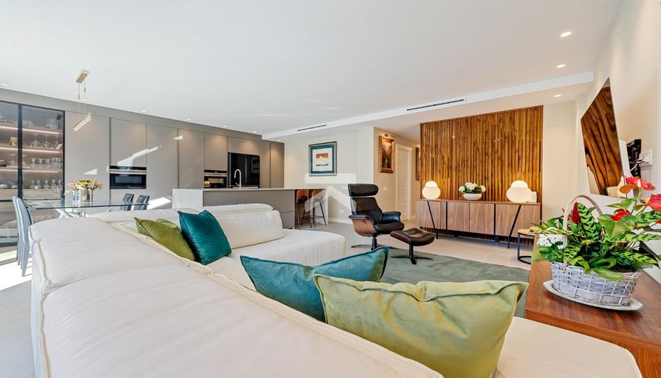 Mención específica tienen los materiales de toda la vivienda, con suelos en madera, armarios empotrados lacados en todas las habitaciones, cocina con muebles en madera oscura de la marca Santos con interiores iluminados y puertas escondidas. En la zona cocina se sitúa una isla en altura, barra de Neolith en acabado mármol de Carrara, placa de inducción integrada invisible en la misma superficie de la isla y electrodomésticos integrados. La carpintería en ventanas y correderas se ha montado con aluminio de alta gama, doble cristal para obtener un interior silencioso y confortable, aire acondicionado por conductos caliente y frío en toda la vivienda y mosquiteras en todas las ventanas.