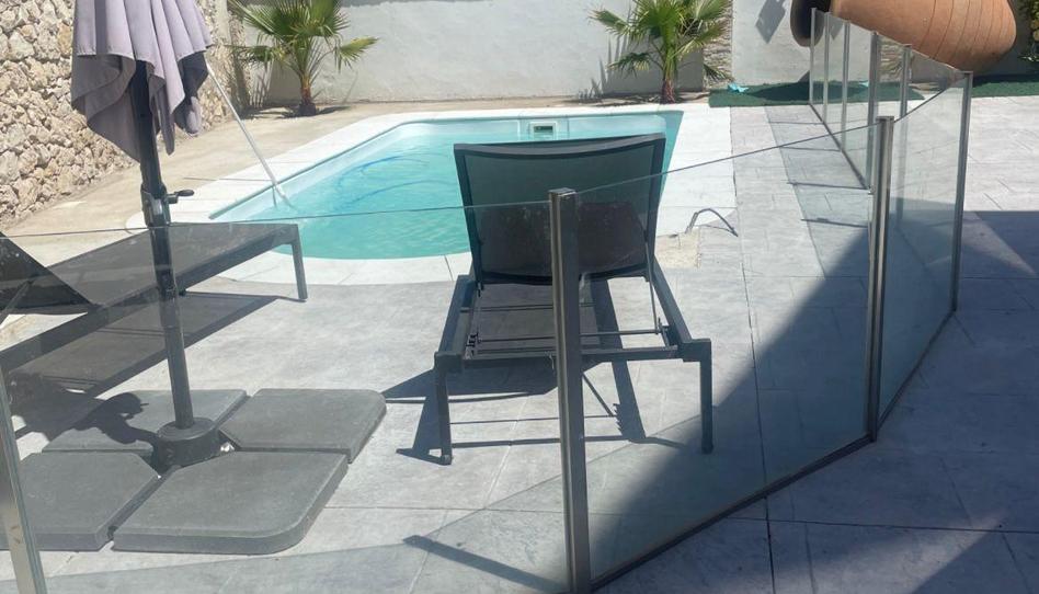 Zona exterior de grandes dimensiones con piscina, aseo y zona de juegos.