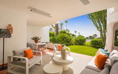 PARTAMENTO EN PLANTA BAJA URB. COSTALITA El apartamento tiene un concepto de vida abierta y muebles contemporáneos e impresiona con acabados de alta calidad como armarios hechos a medida, pisos elegantes, una chimenea eléctrica o un sistema de sonido Bang & Olufsen. La nueva cocina de diseño está totalmente equipada con electrodomésticos Miele y desde la sala de estar abierta se tiene acceso directo a la terraza cubierta y privada con vistas al mar. El dormitorio principal cuenta con un baño diáfano y un vestidor y también tiene acceso directo a la terraza principal. Esta propiedad está lista para entrar a vivir. Cuenta con una plaza de aparcamiento subterráneo privado y un trastero. Costalita es una exclusiva y segura comunidad junto a la playa con amplios jardines tropicales, una piscina estilo laguna y acceso directo a una de las playas más bonitas de la Nueva Milla de Oro. El Villa Padierna Raquet Club, el hotel de 5 estrellas Mett y varios chiringuitos agradables se encuentran a poca distancia a pie y varios supermercados, bares y restaurantes están a poca distancia en coche.