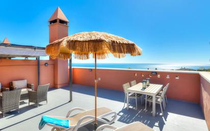 Penthouse in very good condition with fantastic sea views and a private roof terrace of 64 m2 with sun all day. The apartment is sold with a private garage space. From the moment you step into the hall you are struck by the fantastic view and the natural light in the apartment. To the right there is a fully equipped kitchen with dining area and large windows overlooking the communal garden and one of the communal swimming pools. To the left there is the living room with fireplace and glass doors out onto the 22 m2 terrace with built-in sofa and space for a dining table, barbecue and plants. And did we mention that the terrace offers a fantastic view down to the sea and Fuengirola?! The apartment also has two bedrooms and two bathrooms. The master bedroom has an en-suite bathroom and plenty of wardrobe space. To get to the private roof terrace you take the stairs or the lift up one floor and once up you are struck again by the view and there is plenty of space to enjoy the Spanish weather. There are sun beds, an outdoor kitchen, a dining table and a lounge area. The area is very well maintained with mature gardens and two nice pool areas. It is a very quiet area but only 5 minutes by car from the beach and services and you can walk to Los Pacos in 10-15 minutes.