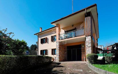 EXCLUSIVA RONALDO INMOBILIARIA. Villa individual en el centro de Irún sobre parcela de 700 m2, con 612 m2 de jardín y sólo dos plantas, cada una de 90 m2 útiles. Todas las orientaciones, con mucha luz y totalmente despejada. Por tener la distribución que tiene, son dos plantas independientes comunicadas por una escalera en un espacio "comunitario", que no intercede para nada cada vivienda, existiendo una puerta de acceso y entrada a cada planta. De forma que es una buena distribución para dos familias que quieran vivir juntas pero cada una en su casa. Tiene la siguiente distribución: PLANTA BAJA: hermoso hall desde donde se visualizan las escaleras de granito, pared de piedra vista a través de las cuales se accede a la planta superior. . Salón con chimenea. . Gran cocina comedor completa, con encimera de granito, muebles de roble y con salida al jardín.. Trastero bajo el hueco de la escalera. . Aseo . Garaje cerrado con aseo. (zona de lavandería) . Escaleras. PRIMERA PLANTA: . 4 dormitorios dobles. . Un cuarto de baño completo con bañera. . Terraza. Todas las estancias exteriores. ÁTICO: diáfano. MATERIALES: agua caliente y calefacción de gas, puertas de paso y suelos de roble (baldosa en el hall), ventanas PVC CLIMALIT. La parcela dispone de dos entradas para vehículos con la posibilidad de aparcamiento para 4 coches o más.