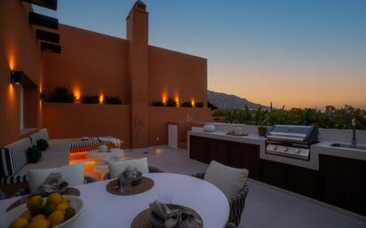 Ubicado en una comunidad residencial cerrada en Nueva Andalucía, este ático dúplex ofrece 210 m² de espacio interior y 110 m² de terrazas privadas distribuidas en dos niveles. Orientado al sur, está diseñado para capturar vistas a La Concha y al mar Mediterráneo. La planta principal incluye una cocina totalmente equipada con electrodomésticos Miele, una sala de estar y comedor de planta abierta, y acceso a una terraza cubierta. Este nivel también alberga tres dormitorios y dos baños, todos con soluciones de almacenamiento integradas y acabados neutros. La planta superior alberga la suite principal, con vestidor, baño en suite y acceso a una amplia terraza en la azotea. La terraza dispone de cocina exterior con barbacoa integrada, comedor cubierto y zona lounge. La distribución prioriza funcionalidad, luz natural y privacidad. Incluye ventanas de doble acristalamiento, climatización y garaje privado con capacidad para dos vehículos. La comunidad ofrece acceso a piscina y jardines comunitarios. Renovado en 2025, el inmueble refleja un diseño actualizado con acabados de alta calidad. Ubicado cerca de campos de golf, colegios internacionales y zonas comerciales, esta propiedad ofrece una vivienda segura y de bajo mantenimiento en una de las zonas más consolidadas de Marbella. Aspectos Destacados • Comunidad cerrada en Nueva Andalucía • 4 dormitorios, 3 baños distribuidos en dos plantas • 110 m² de terrazas privadas con cocina exterior y vistas al mar • Orientación sur con vistas a La Concha y al Mediterráneo • Distribución abierta con cocina equipada con Miele • Suite principal con vestidor y acceso a la azotea • Renovado en 2025 con acabados actualizados • Garaje privado para dos vehículos • Acceso a piscina y jardines comunitarios • Cerca de campos de golf, colegios y comercios