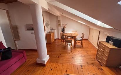 Luminoso ático bajo-cubierta, en edificio de una sola vivienda por planta, de estructura de madera. De planta cuadrada, la vivienda está dividida en 2 mitades, en una de ellas está el amplio salón-comedor, con luz a través de claraboyas en el tejado, y en la otra mitad están una pequeña cocina, el baño, y la habitación, no habiendo pasillo como tal. Gran espacio de almacenamiento (trastero) en la parte baja del tejado, con unos dos metros de fondo, aunque lógicamente con poca altura. Todas las ventanas están renovadas con doble acristalamiento. Tejado del edificio en buenas condiciones. El estado general es bueno, como para poder entrar a vivir. Calefacción y agua caliente eléctricos. No hay gastos de comunidad regulares. Cuando hay que hacer algo, se decide entre las 4 propiedades.