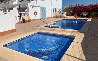 Estupendo apartamento situado en 1ª planta ático en Palomares. Este apartamento con salón comedor amplio, cocina amplia y equipada, baño completo, dormitorio doble. Desde el salón accedemos a una estupenda terraza que tiene vistas hacía el interior de la urbanización y acceso a un solárium privado con una parte con porche y vistas al mar. El apartamento cuenta con aire acondicionado centralizado, calefacción, parking subterráneo, Piscina comunitaria y a 500 metros del pueblo.