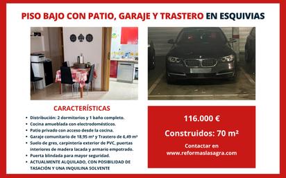 Piso Bajo con Patio, Garaje y Trastero en Esquivias para INVERSORES ACTUALMENTE ALQUILADO, CON POSIBILIDAD DE TASACIÓN Y UNA INQUILINA SOLVENTE ¿Buscas una inversión segura? Inmobiliaria & Reformas La Sagra te ofrece en EXCLUSIVA este encantador piso bajo en Esquivias. Es una oportunidad única: actualmente alquilado, con posibilidad de tasación y una inquilina solvente que garantiza una rentabilidad estable desde el primer día. Características principales: - Superficie: 70,09 m² construidos. - Distribución: 2 dormitorios y 1 baño completo. - Cocina amueblada con electrodomésticos: nevera, lavadora, horno y calentador de agua eléctrico. - Patio privado con acceso desde la cocina, perfecto para disfrutar al aire libre. - Garaje comunitario de 18,95 m² incluido en el precio. - Trastero amplio de 6,49 m² para almacenaje extra. - Zona de recreo comunitaria ideal para niños o momentos de descanso. - Suelo de gres, carpintería exterior de PVC, puertas interiores de madera lacada y armario empotrado. - Puerta blindada para mayor seguridad. Ideal para inversión: - Este piso ya está generando ingresos, lo que lo convierte en una opción perfecta si estás pensando en comprar para alquilar. Además, se puede tasar, lo que facilita las gestiones de financiación. - Entorno tranquilo y bien comunicado: - Situado en una zona residencial de Esquivias, con fácil acceso a servicios, comercios, colegios y transporte. - Una localidad en crecimiento, ideal tanto para vivir como para invertir. ¡No dejes pasar esta oportunidad única de inversión! ¡Contáctanos hoy mismo a través del botón de WhatsApp de la web! www.reformaslasagra.com Inmobiliaria & Reformas La Sagra Tu inversión segura, con acompañamiento integral y visión a futuro.
