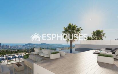 VILLAS DE LUJO DE OBRA NUEVA EN FINESTRAT CON VISTAS AL MAR Villas de lujo ubicadas en complejo residencial Obra Nueva en Finestrat. Estas villas constan de dos plantas, solárium, sótano y jardín interior con piscina privada. Cada villa tiene su propio ascensor. El solárium ofrece una vista amplia e inolvidable de Benidorm y el mar. Estas villas son únicas por su diseño y comodidades: una gran sala de estar, amplios dormitorios en suite en el primer piso, un solárium para relajarse y disfrutar de los atardeceres, una piscina infinita contemporánea y una gran terraza para vacaciones y relajación. Residencial situado a 5 min en coche de todos los servicios que ofrece Benidorm y en un entorno con una temperatura media anual de 20ºC y 300 días de sol al año, a 44 km del aeropuerto de Alicante, a 3 km del mar y a 200 metros del golf.\n