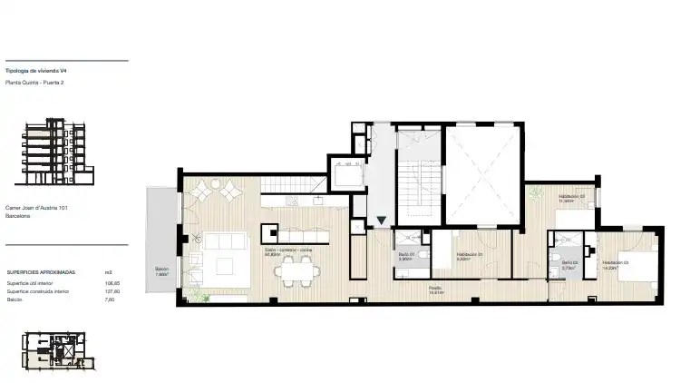 La zona de día ofrece un amplio y luminoso salón-comedor con cocina integrada, con acceso directo a un balcón de 3 m2 orientado al noreste , que proporciona luz natural suave y agradable durante las primeras horas del día. La zona de noche dispone de tres dormitorios, uno de ellos en suite con baño privado y orientada al suroeste, ideal para relajarse y disfrutar del sol de la tarde. En la planta alta tiene la terraza de uso privativo de 59 m2, se accede desde el ascensor.