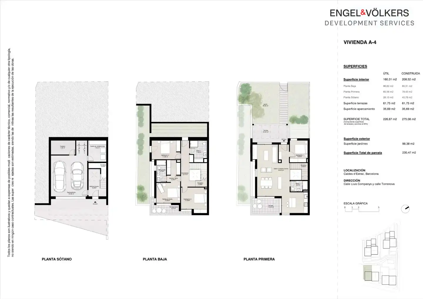 La vivienda A1 es una casa adosada de tres plantas con ascensor incluido, que ofrece 4 dormitorios amplios y 3 baños perfectamente distribuidos para el confort familiar. Dispone de una superficie útil de 161,6 m² y una construida de 207,3 m², a la que se suman 61,8 m² de terrazas para disfrutar del exterior. El garaje, de 36,9 m², se complementa con un jardín privado de 112,9 m², ideal para momentos de relax o encuentros al aire libre.