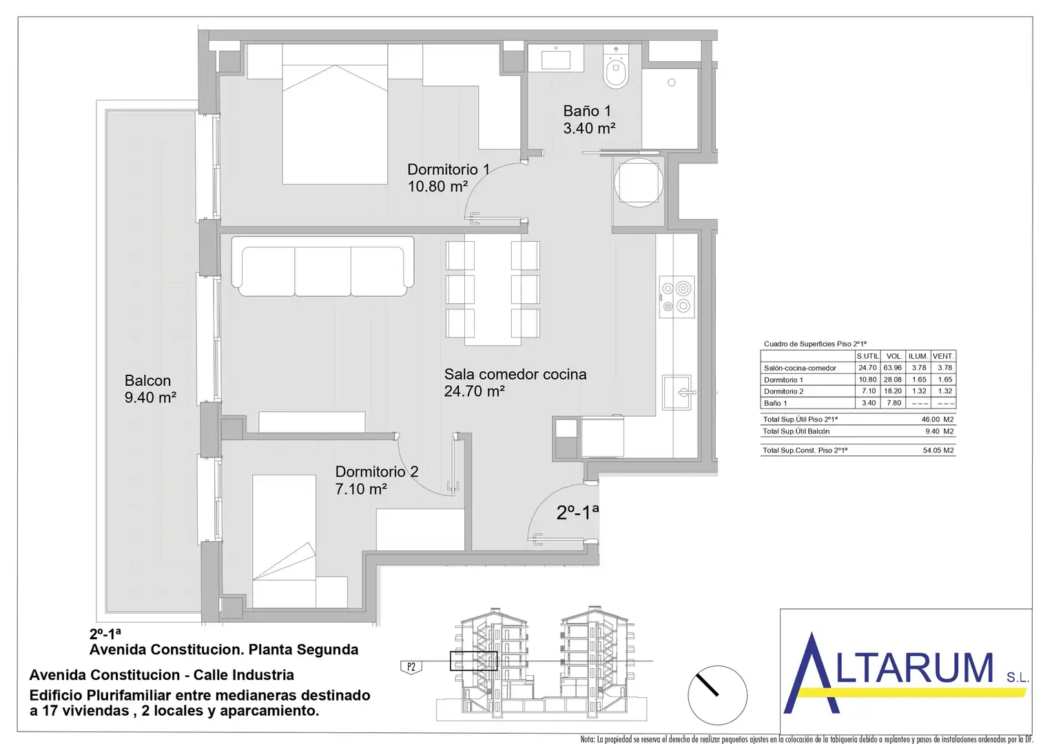 Superficie útil de la vivienda: 46 m² - Superficie construida: 54,05