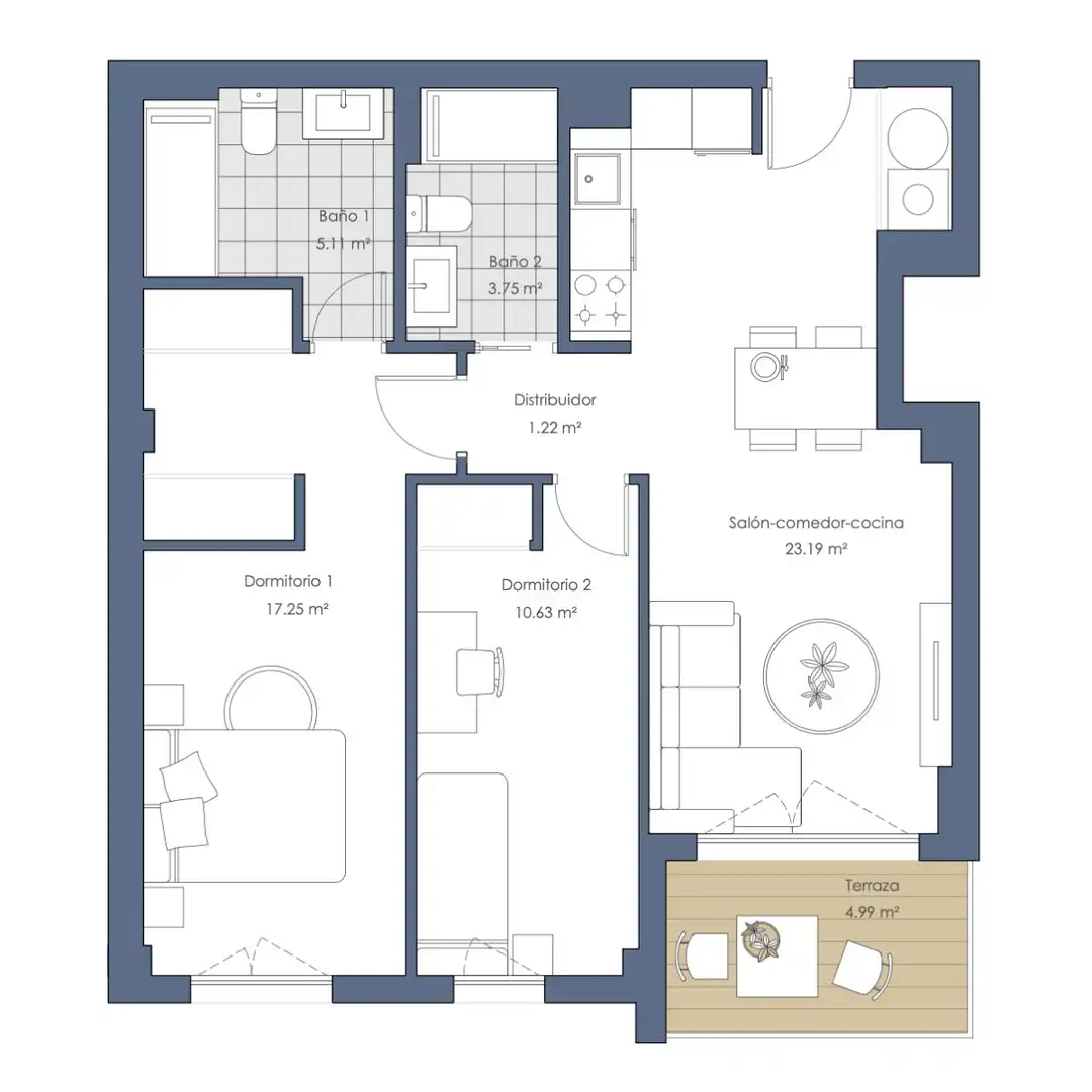 Las viviendas destacan por su diseño contemporáneo y funcional, con interiores luminosos, estancias exteriores y acabados actuales que garantizan durabilidad y comodidad. Los dormitorios han sido concebidos para disfrutar de ventilación y claridad a lo largo de todo el día, mientras que los baños combinan practicidad y estética en un ambiente moderno.