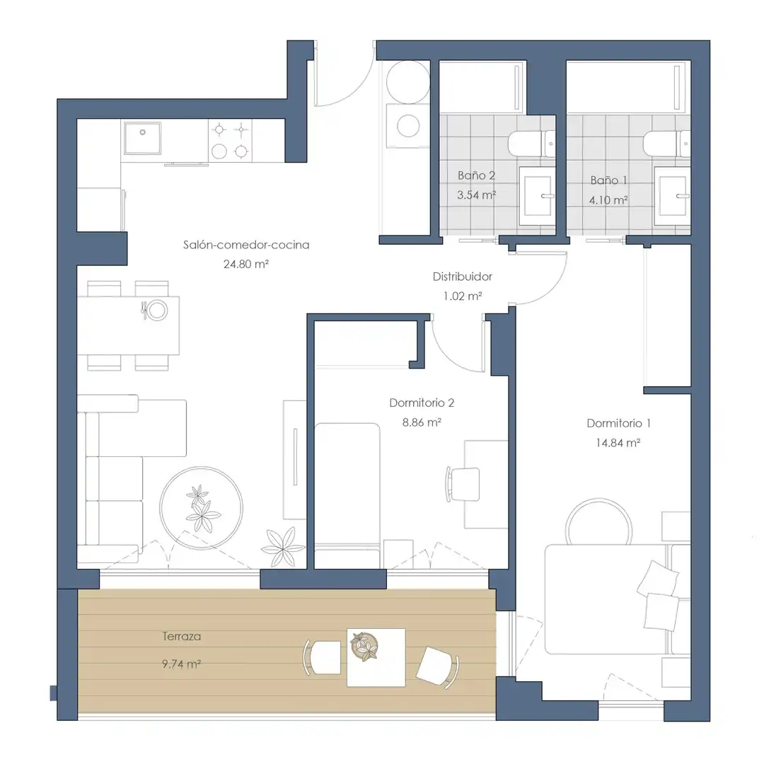 Las viviendas destacan por su diseño contemporáneo y funcional, con interiores luminosos, estancias exteriores y acabados actuales que garantizan durabilidad y comodidad. Los dormitorios han sido concebidos para disfrutar de ventilación y claridad a lo largo de todo el día, mientras que los baños combinan practicidad y estética en un ambiente moderno.