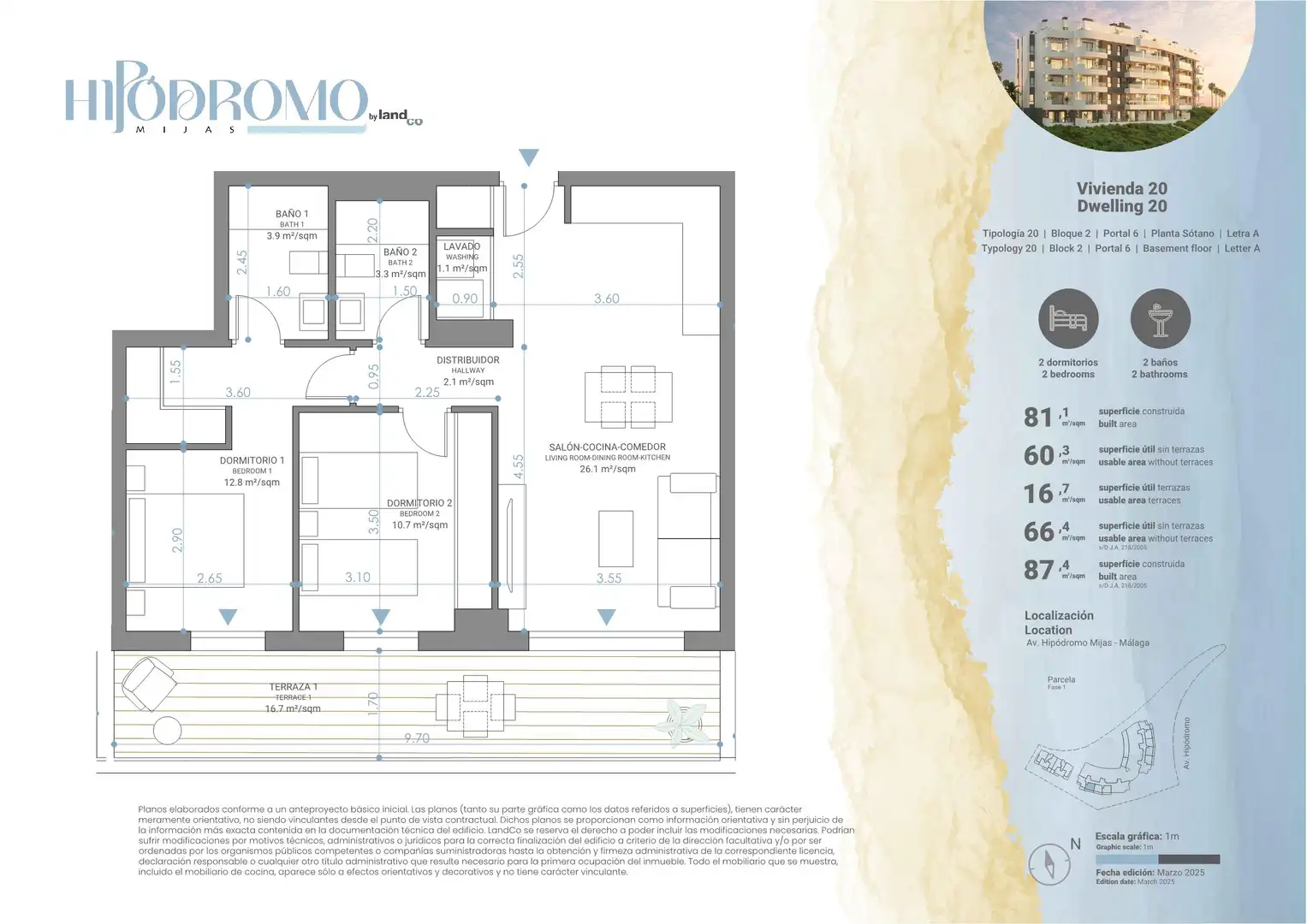 Descubre Hipódromo Mijas by landCo, una exclusiva promoción de 117 viviendas de 1, 2 y 3 dormitorios, diseñadas con alta calidad en materiales y acabados. Disfruta de luminosas terrazas y espectaculares áticos con terrazas de más de 125 m² y vistas al horizonte mediterráneo. Todas las viviendas disponen de garaje y trastero para mayor comodidad.