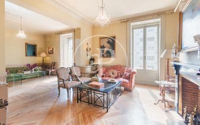 PISO EXTERIOR Y LUMINOSO EN LA MILLA DE ORO Aproperties presenta esta exclusiva propiedad en plena Milla de Oro madrileña. Una exclusiva propiedad en finca señorial de principios de siglo XX de fachada clásica con miradores de forja y balcones, precioso paso de carruajes, ascensor de jaula protegido y portal de mármol. Se trata de una segunda planta de 300 m2 construidos según catastro exterior con precioso mirador y balcón orientados al sur. A través del magnífico hall distribuidor accedemos, por un lado a la zona de día compuesta por una gran zona de despacho con librería boisserie a medida de suelo a techo, una preciosa zona social con chimenea de marmol y maravilloso comedor formal que conecta con la cocina independiente de gran tamaño. Destacamos el suelo original de pino melis, molduras originales y techos altísimos de más de 3m. La zona de noche está compuesta por tres amplios dormitorios con sus baños completos en suite y armarios empotrados de gran tamaño. Todas las habitaciones tienen ventanas abalconadas orientadas a un gran patio de manzana que les aporta luminosidad y tranquilidad. Completan la vivienda un aseo de cortesía y varios armarios empotrados adicionales. La vivienda tiene puerta de servicio y portero en finca. Su planta cuadrada y su perfecta distribución hacen de esta casa un lienzo en blanco para crear un bonito hogar en la mejor y más demanda zona de la capital. ¿Te imaginas vivir aquí? Ref. VM2603019 Nº AICAT: 8446