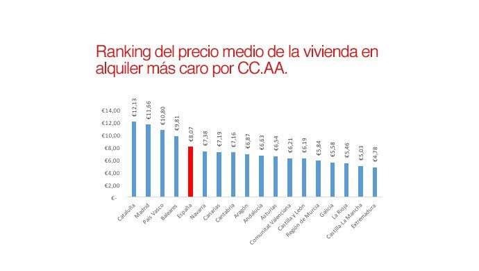 En cuanto al ranking de precios, Cataluña es la comunidad más cara para alquilar una vivienda de segunda mano, con un precio de 12,13 €/m2 al mes. Le sigue Madrid (11,66 €/m2 al mes) y País Vasco (10,80 €/m2 al mes). En el lado opuesto, Extremadura (4,78 €/m2 al mes) y Castilla-La Mancha (5,03 €/m2 al mes) son las dos comunidades con los precios de la vivienda en alquiler más asequibles.