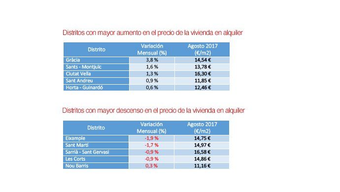 El distrito de Salamanca continúa siendo el más caro de Madrid, con un precio medio de 16,35 €/m2 y un ascenso mensual respecto al mes anterior del 0,1%. El más barato es Villaverde, que tiene un precio medio de 8,66 €/m2 al mes y este mes de agosto asciende el precio un 2,8% respecto al mes anterior. De los 10 distritos catalanes estudiados, en seis de ellos se registran incrementos en el precio del alquiler. La subida más alta se da en Gràcia (3,8%), Sants – Montjuïc (1,6%) y en Ciutat Vella (1,3%). En cuanto a los descensos, la caída más notable se da en el distrito de Eixample (-1,9%), seguido de Sant Martí (-1,7%).