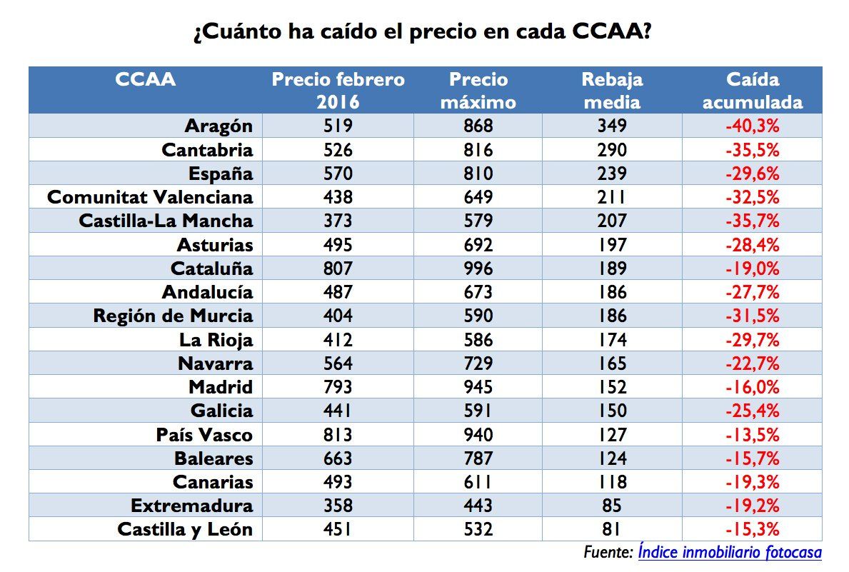 En cuanto a las rebajas en el precio del alquiler por comunidades autónomas es en Aragón donde se registra la mayor caída en el precio. En concreto, el alquiler se ha abaratado de media 349 € en ocho años. Fue en junio de 2008 cuando se registró el precio máximo en Aragón (10,85 €/m2) y alquilar una vivienda costaba 868 €. Desde entonces el precio se ha abaratado un 40,3% y actualmente alquilar una vivienda cuesta de media 519 €.