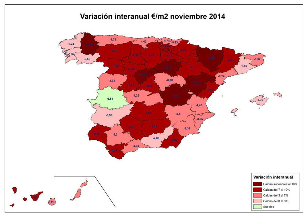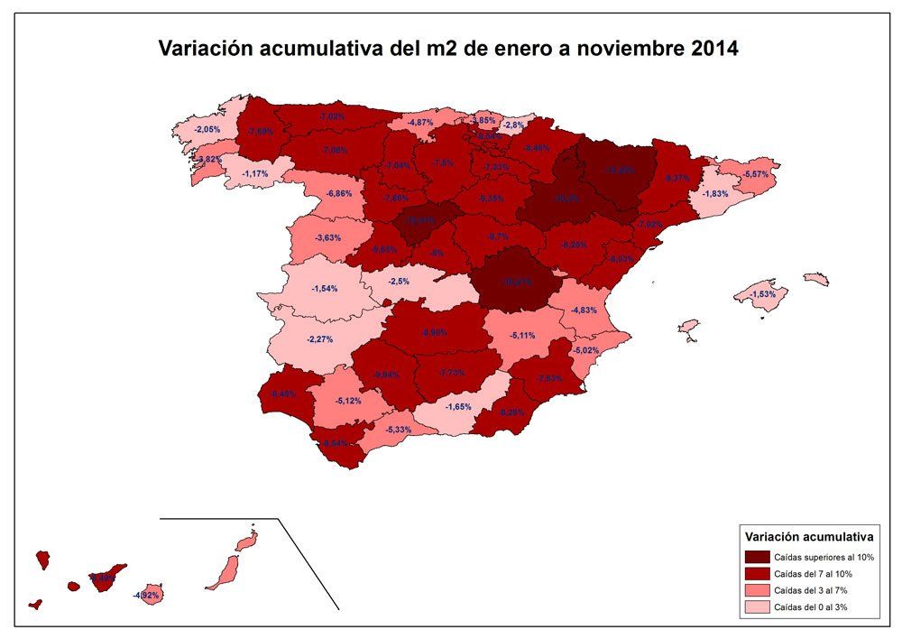 El precio de la vivienda descendió, durante los primeros 11 meses del año, un 6,5% y en noviembre se situó en 1.637 euros/m2. De hecho, el precio de la vivienda de segunda mano en España ha bajado de media 105.186 € desde que alcanzó el precio máximo en abril de 2007, según el último análisis de fotocasa. En esa fecha, comprar una vivienda costaba de media 236.174 € (2.952 €/m2) para un piso de 80 m2 y, a noviembre de 2014, el precio medio se sitúa en 130.988 €. Esta reducción, de 105.186 €, equivale a una caída del 43,3% en siete años.
