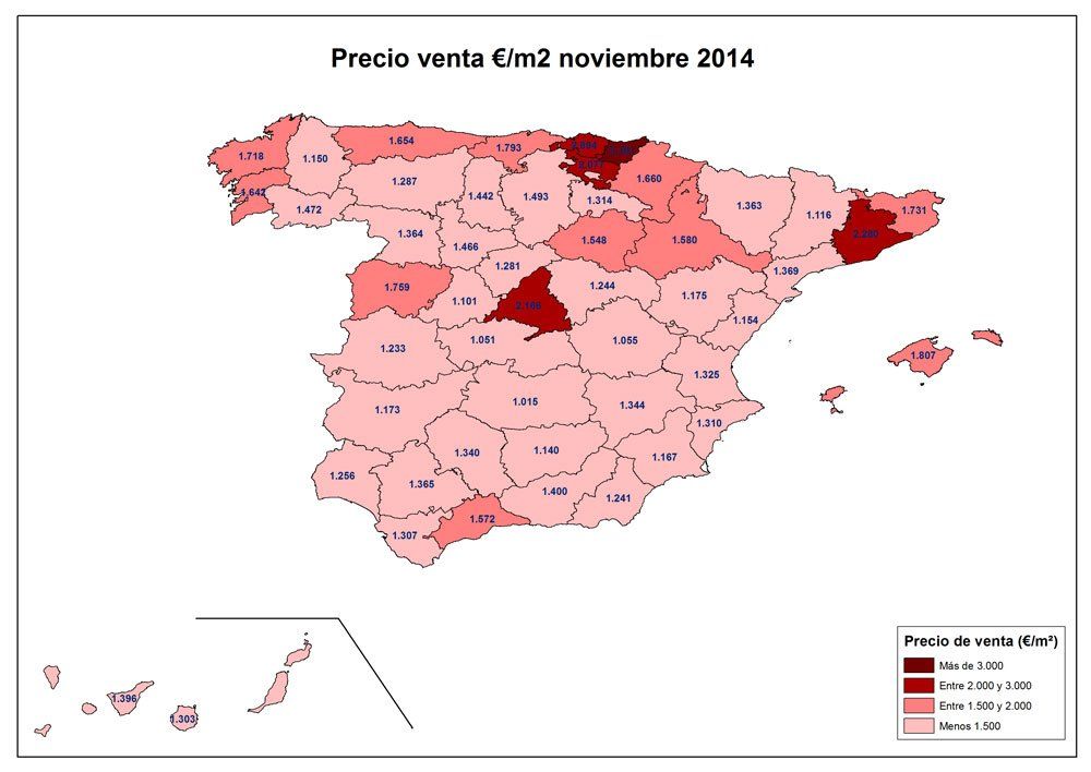 Guipúzcoa continua siendo la provincia más cara, con un precio de 3151 €/m2, seguida de Vizcaya (2894 €/m2) y Barcelona (2.280 €/m2). Por el contrario, Ciudad Real (1.015 €/m2), Toledo (1.051 €/m2 y Cuenca (1.055 €/m2) son las provincias con el precio del metro cuadrado de la vivienda de segunda mano más barato.