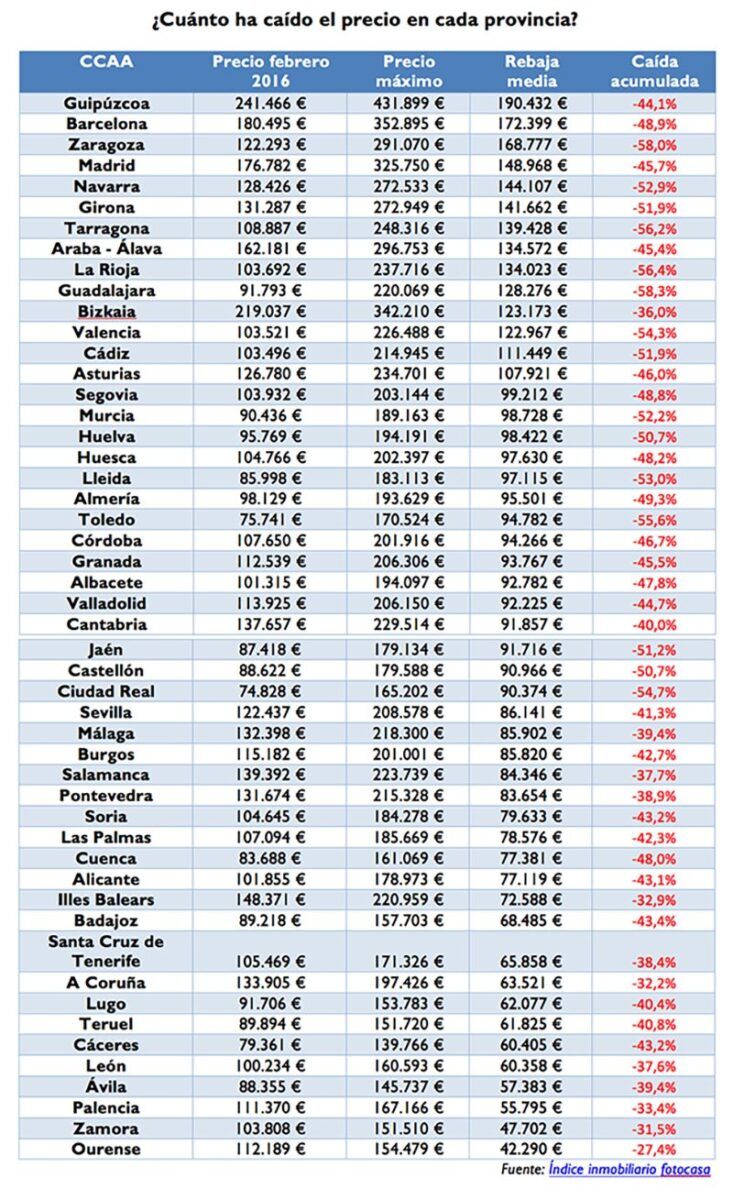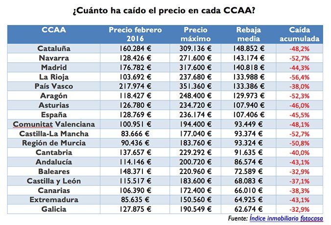 El precio de la vivienda de segunda mano en España ha bajado de media 107.406 € desde que alcanzó el precio máximo en abril de 2007, según el último análisis del portal inmobiliario fotocasa. En esa fecha, comprar una vivienda costaba de media 236.174 € (2.952 €/m2) para un piso de 80 metros cuadrados y a febrero de 2016 el precio medio se sitúa en 128.769 €. Esta reducción en el precio de la vivienda de segunda mano, de 107.406 €, equivale a una caída del -45,5% en nueve años.