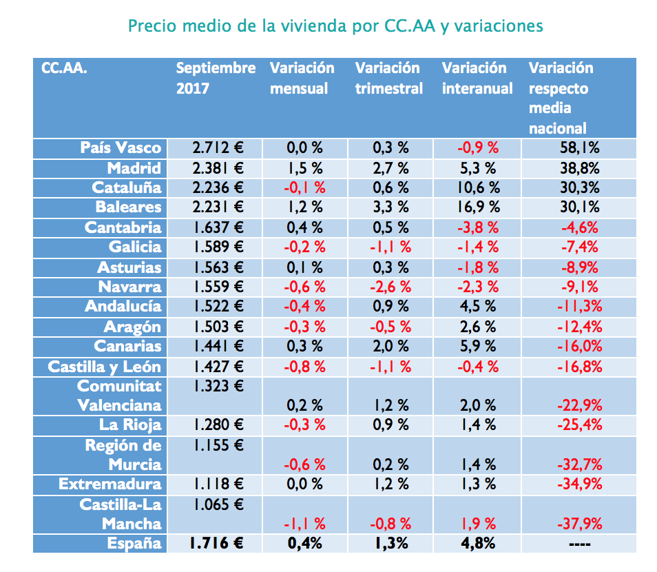 Precio medio de la vivienda por CC.AA y variaciones