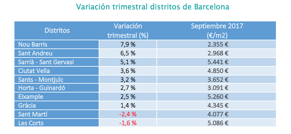 En la ciudad de Barcelona, ocho de los 10 distritos incrementan el precio en el tercer trimestre del año. El mayor ascenso se da en Nou Barris, con una subida del 7,9%. Le siguen la zona de Sant Andreu, con una subida de un 6,5%, y Sarrià – Sant Gervasi con un 5,1%.