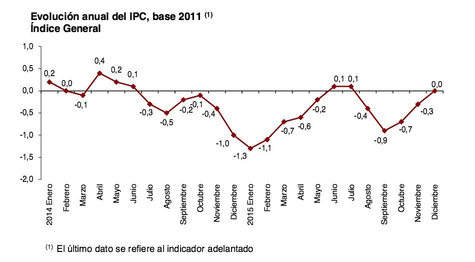 El Índice de Precios de Consumo (IPC) cerró el mes de diciembre en el 0% y elevó tres décimas su tasa interanual respecto al mes anterior, debido al comportamiento de los precios de los carburantes y lubricantes (gasoil y gasolina), que bajaron menos que en 2014, según el indicador adelantado publicado por el Instituto Nacional de Estadística (INE).