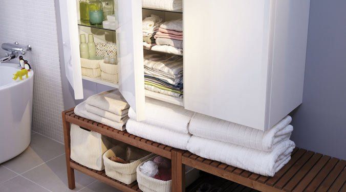 Se trata del mobiliario más importante para el almacenaje de los complementos textiles y de belleza. Toallas, secadores y productos cosméticos estarán a salvo del polvo y la humedad gracias a los armarios de pared y los muebles bajo lavabo. Estos últimos se integran en el lavamanos aprovechando un espacio que, de otra forma, quedaría desierto.