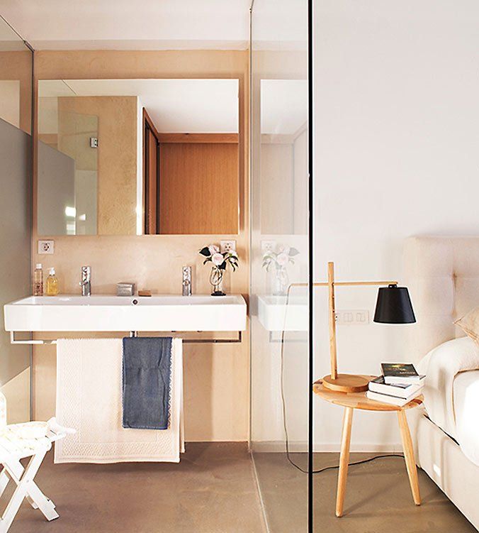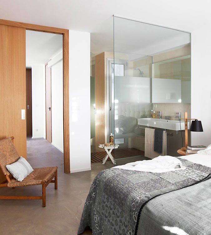 Me encanta la separación de espacios con puertas correderas de cristal, y el suelo de mortero. Hace que el espacio sea muy «natural».