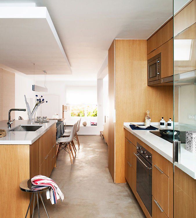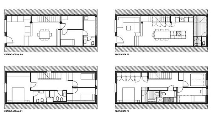 La distribución de las zonas de estar gira en torno a un eje central, en el sentido longitudinal de la planta y formando un espacio de reunión a modo de comedor en isla que, a su vez, está adosado al grupo de lavado de la cocina. La zona de cocción, en el costado opuesto, queda enrasada al bajo-escalera, que se extiende hasta el extremo de la planta con las funciones de lavadero en la zona de jardín, aprovechando toda su profundidad. El salón queda relegado a la zona de acceso de la vivienda, dividiendo el área propia de ocio y descanso del espacio funcional de comedor-cocina.