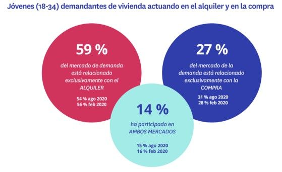 El grueso de la actividad se concentra en el lado del arrendamiento, donde actúa el 59% de los jóvenes demandantes de vivienda (en 2020 ese porcentaje era del 56 %), mientras que otro 27% solo busca casa para comprar y un 14 % (frente al 16 % de 2020) participa en ambos mercados.