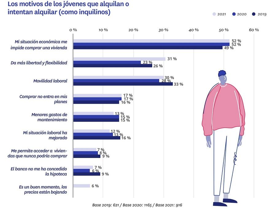 La mejoría de la situación laboral es el único motivo de estos jóvenes inquilinos (o aspirantes a serlo) que —como ya sucedía con los que habían comprado o intentado comprar— mantiene una clara tendencia: en los últimos dos años ha descendido en cuatro puntos porcentuales (del 16% en 2019 se ha pasado al 12% en 2021).