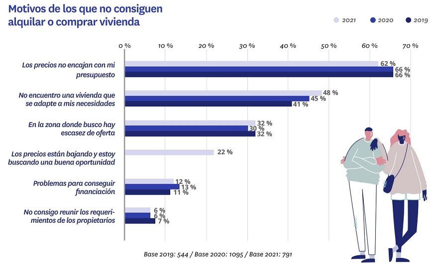 Otro cambio que ha traído la pandemia, como hemos visto antes, es un mayor protagonismo de la intención de mejorar su vivienda actual por parte de quienes están buscando. Su contrapartida es el también mayor peso que tiene la imposibilidad de encontrar un inmueble acorde con sus necesidades por parte de estos jóvenes demandantes que no han llegado a cerrar ninguna operación ni de compra ni de venta: del 41% de 2019 se ha pasado al 48 % en 2021.